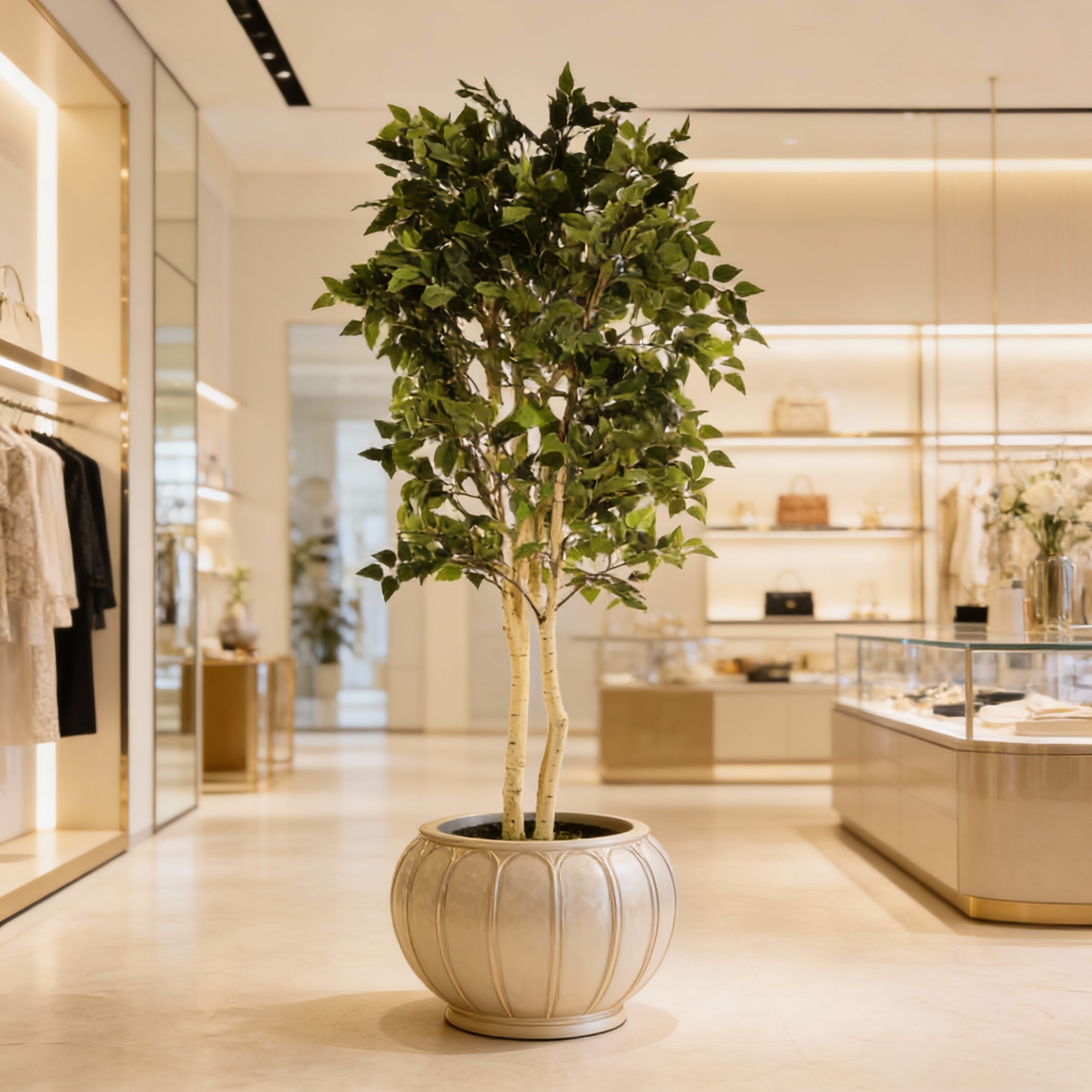 Abedul artificial de 175 cm, ignífugo y realista, ideal para aportar elegancia natural y seguridad a espacios profesionales.