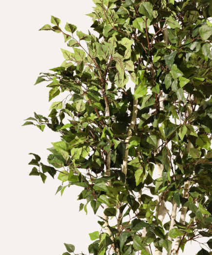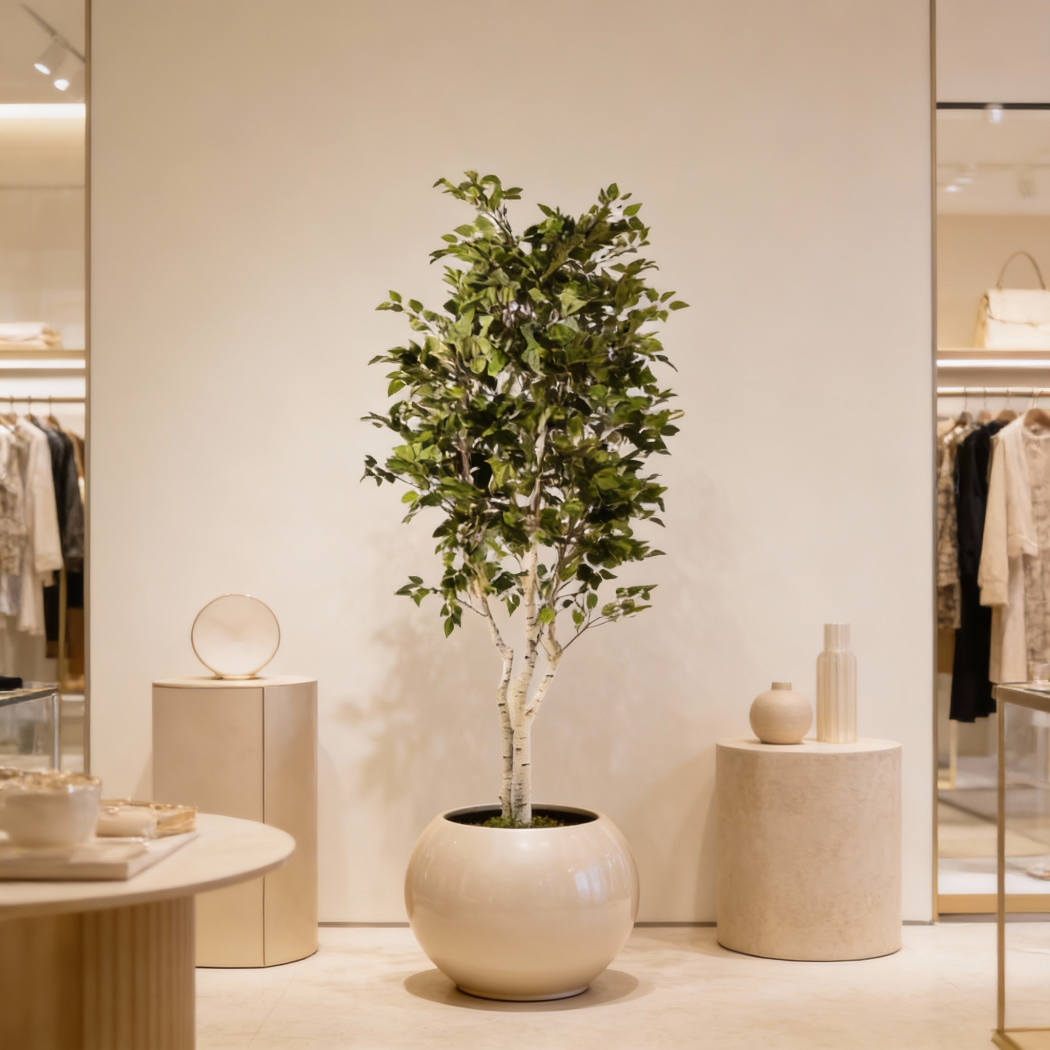 Abedul artificial de 210 cm, ignífugo y realista, ideal para aportar elegancia natural y seguridad a espacios profesionales.