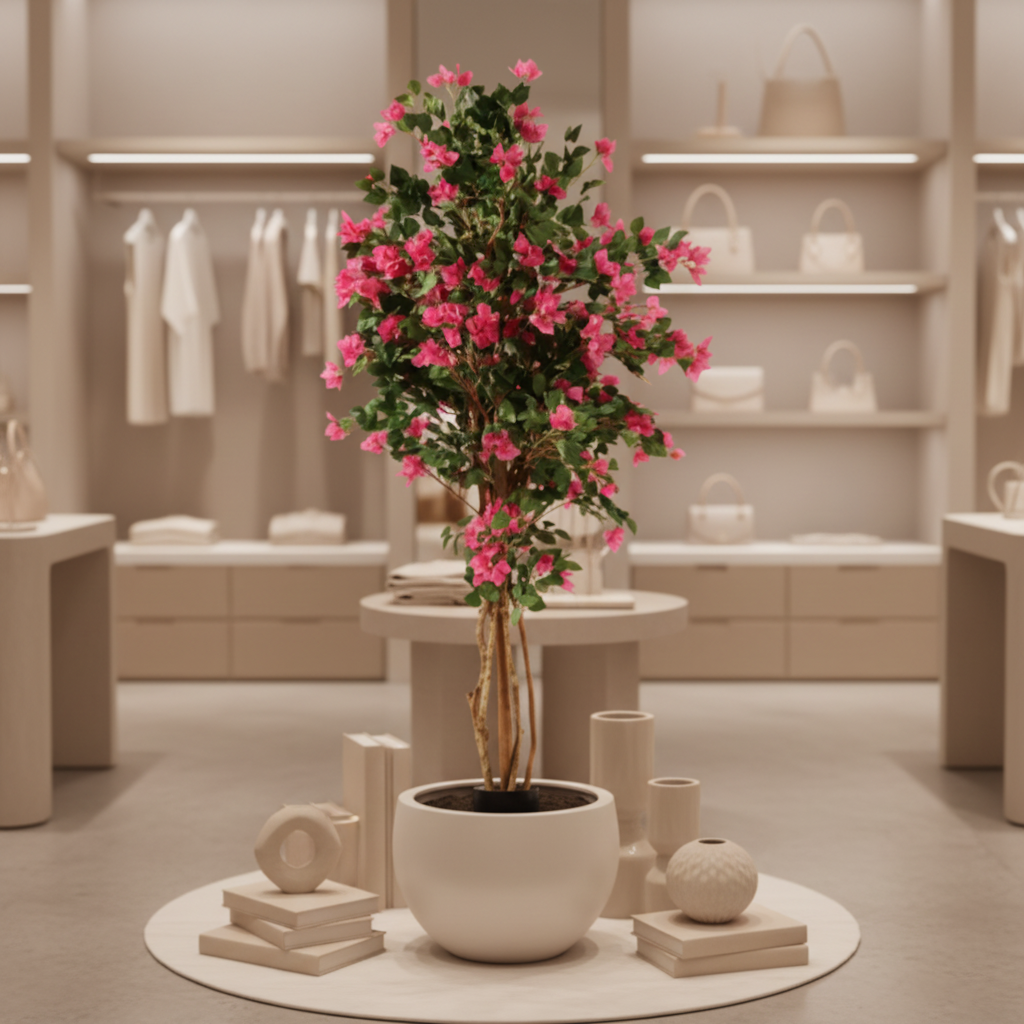 La Buganvilla artificial de 180 cm, destinada exclusivamente a uso en interiores, destaca por su follaje denso y sus flores de acabado realista, aportando un toque decorativo elegante y lleno de color a cualquier entorno profesional. Su estructura sólida y su diseño libre de mantenimiento la convierten en una solución eficiente para hoteles, oficinas, comercios y proyectos contract que requieren elementos vegetales duraderos, uniformes y de alta calidad sin la complejidad asociada al cuidado de plantas naturales.