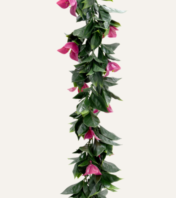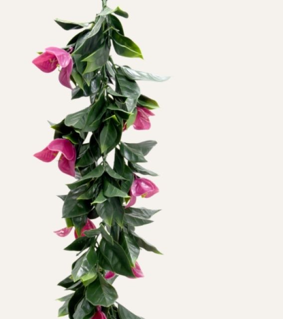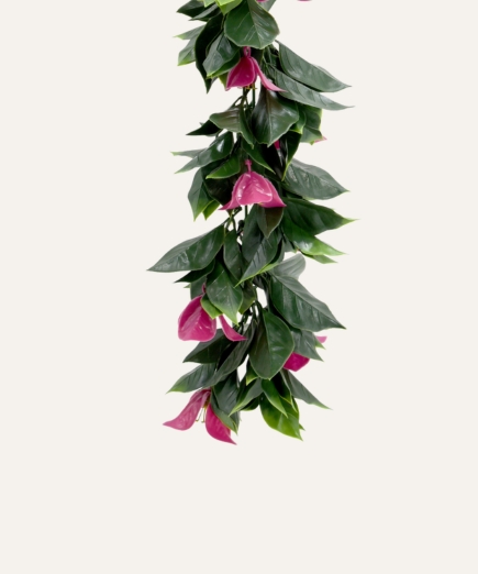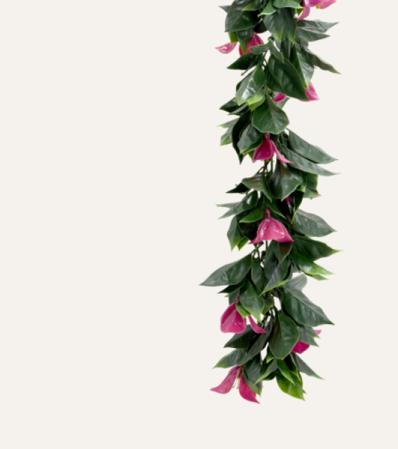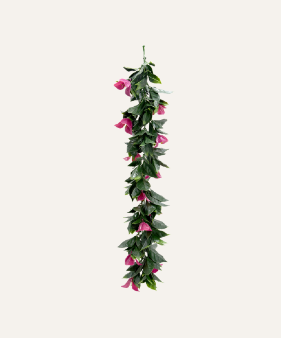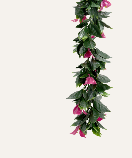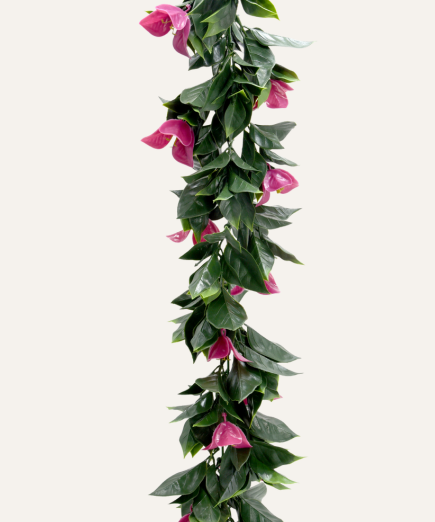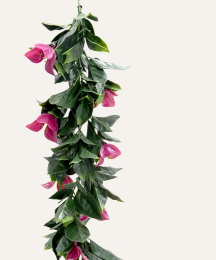 Su estructura flexible y resistente permite una caída natural y uniforme, ideal para decorar pérgolas, balcones, fachadas, paredes o zonas de paso tanto en interiores como en exteriores protegidos. Libre de mantenimiento, la buganvilla colgante artificial es una solución duradera y estética para hoteles, restaurantes, comercios y proyectos contract que buscan un toque floral distintivo sin los cuidados de la planta natural.