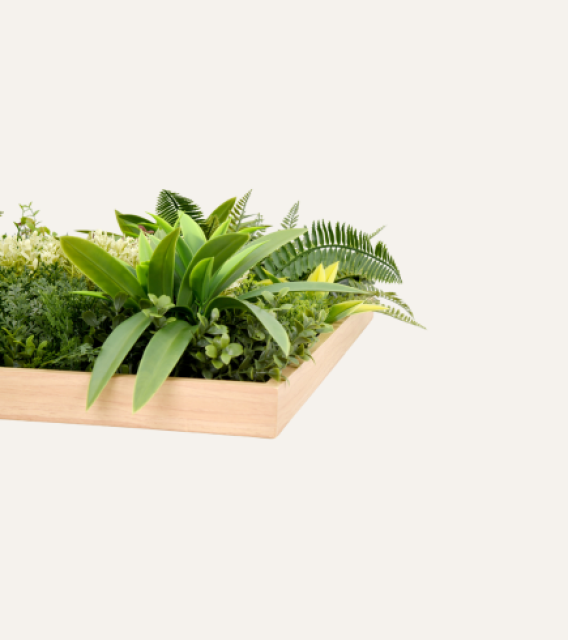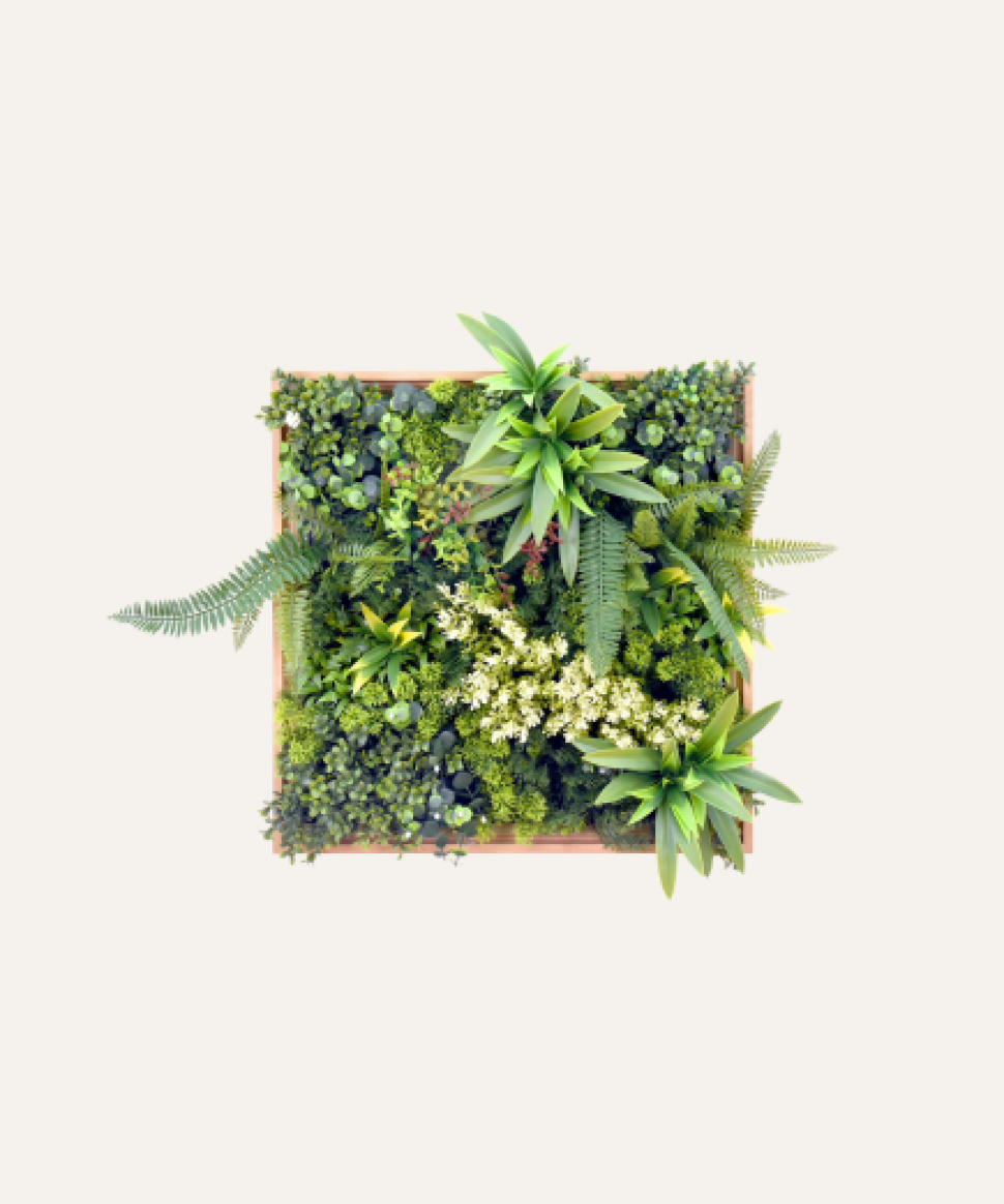 El cuadro vegetal artificial Dino de 50×50 cm aporta un toque de verde profesional en formato compacto, combinando plantas y hojas de apariencia natural en una pieza versátil que mejora la estética de recepciones, oficinas y espacios comerciales sin requerir mantenimiento ni recursos adicionales.
