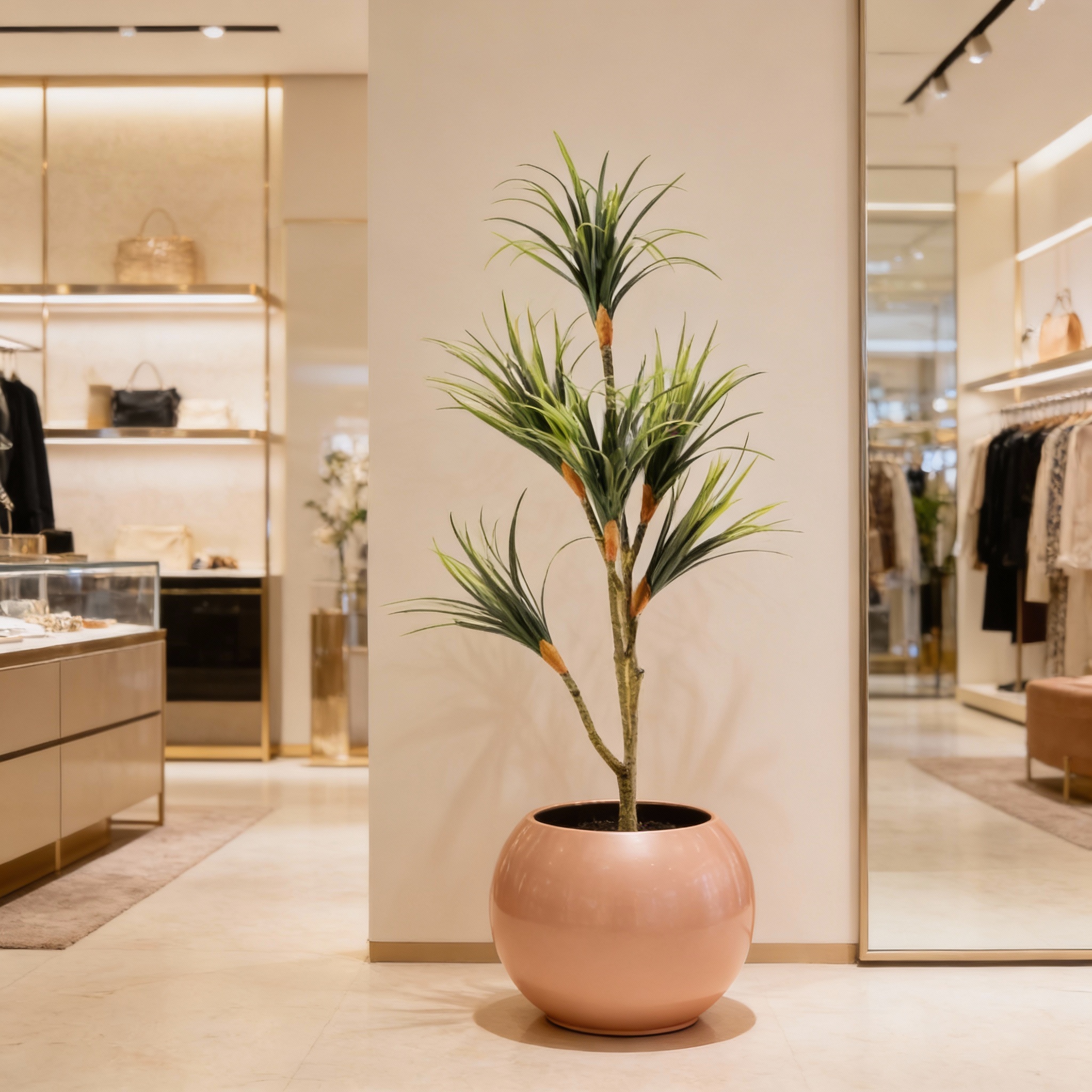La Dracena artificial de 150 cm, destinada exclusivamente a uso en interiores, presenta un acabado realista con un follaje cuidado al detalle que aporta verticalidad y elegancia a cualquier espacio profesional. Su diseño resistente y libre de mantenimiento la convierte en una solución eficiente para proyectos corporativos, hoteleros, comerciales y contract que buscan integrar vegetación decorativa de aspecto natural sin los costes operativos asociados a las plantas vivas.