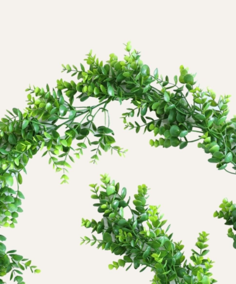 Ideal para hoteles, oficinas, comercios y proyectos contract, la guirnalda de eucalipto artificial combina funcionalidad y estética, creando ambientes acogedores y visualmente atractivos.