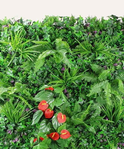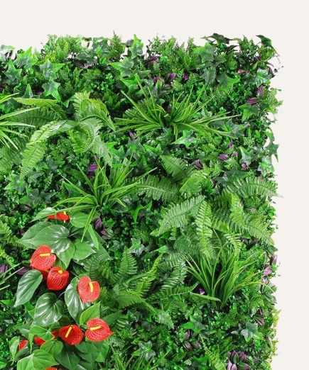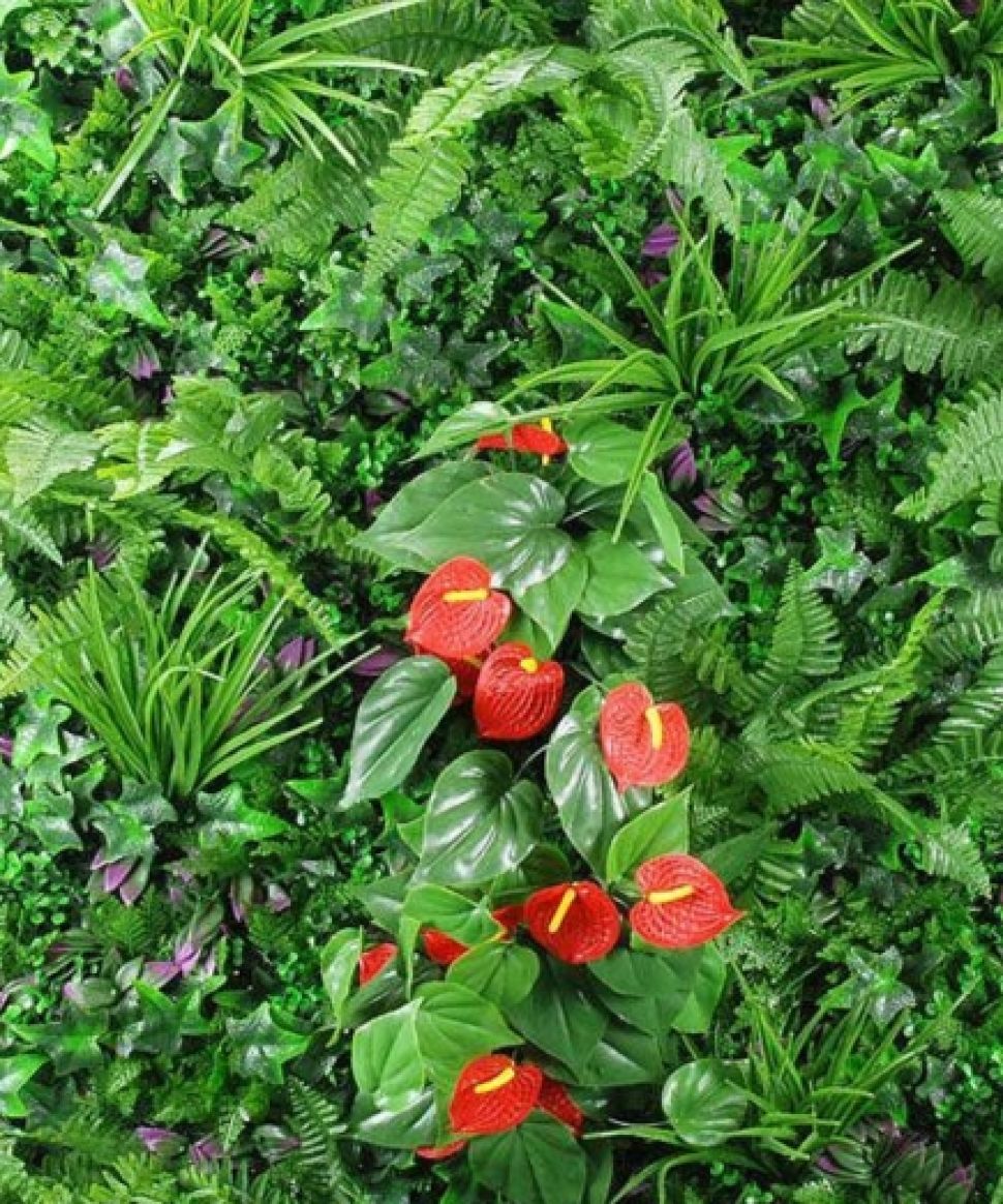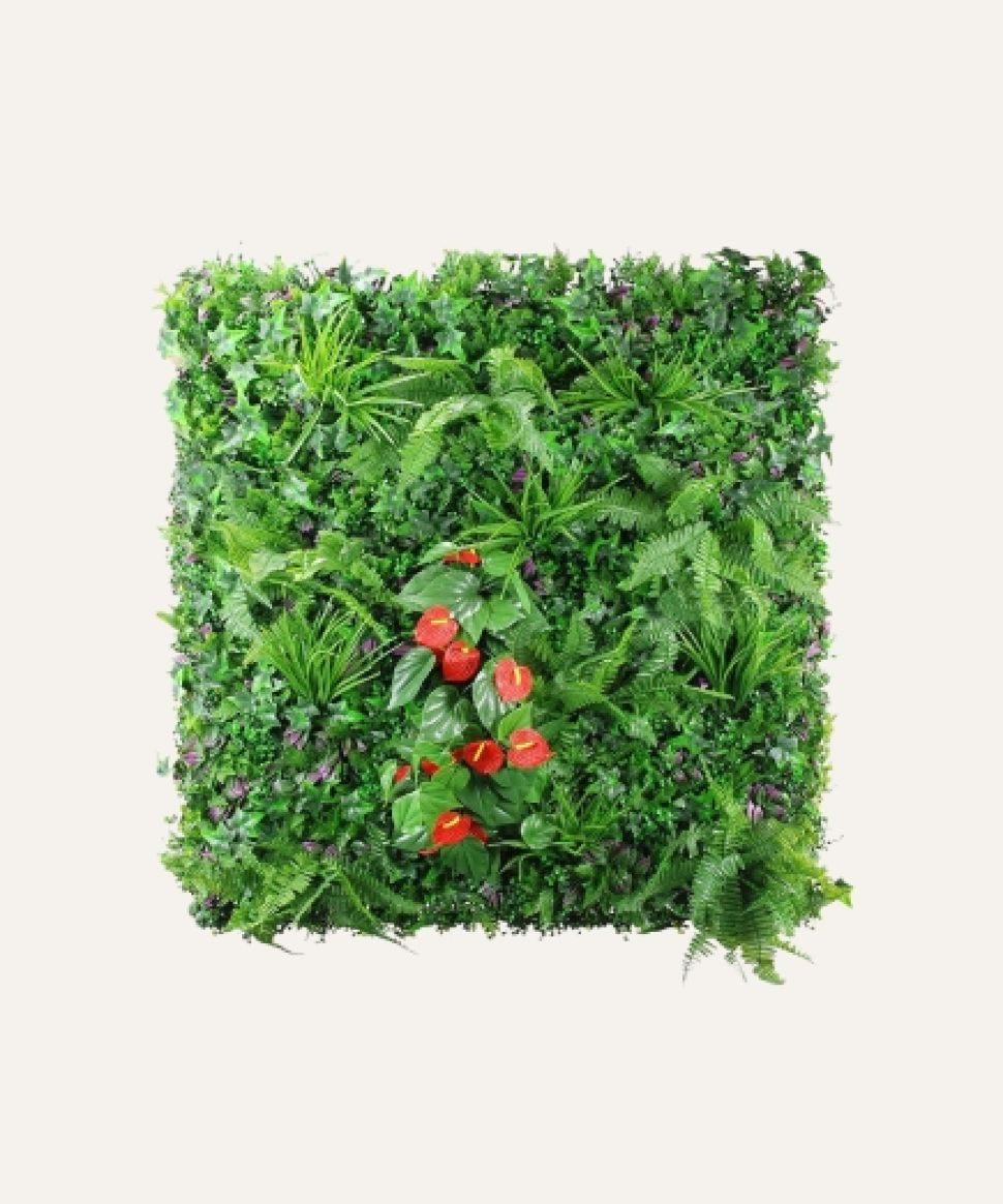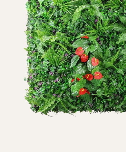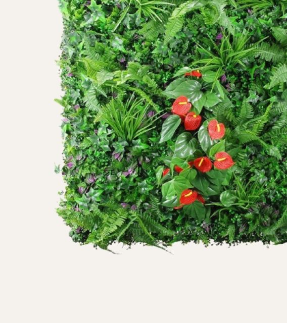 El jardín vertical artificial de 100×100 cm es una solución decorativa premium diseñada para proyectos profesionales que buscan impacto visual inmediato sin costes de mantenimiento. Su composición de follaje sintético de alta densidad ofrece un aspecto natural y estable, adecuado para instalaciones en interior y exterior.