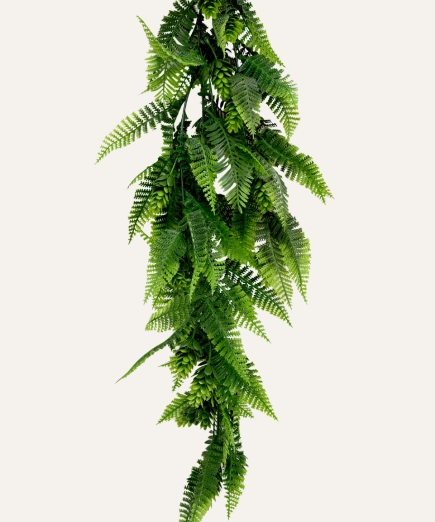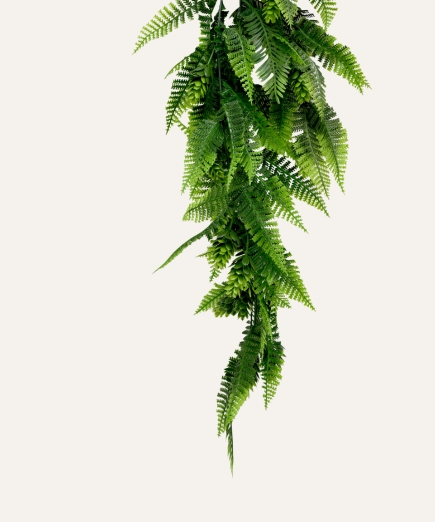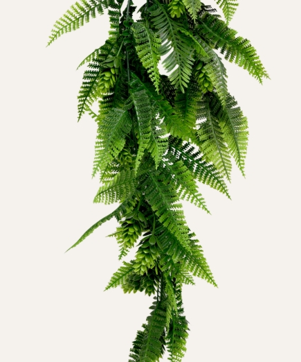 Su estructura flexible y resistente permite una caída uniforme y estable, adaptándose a múltiples aplicaciones tanto en interiores como en exteriores protegidos, como techos, estanterías, paredes o zonas de paso. Libre de mantenimiento, el helecho mixto colgante artificial ofrece una alternativa duradera y estética para hoteles, oficinas, comercios y proyectos contract que buscan vegetación decorativa de alta calidad sin los cuidados asociados a plantas naturales.