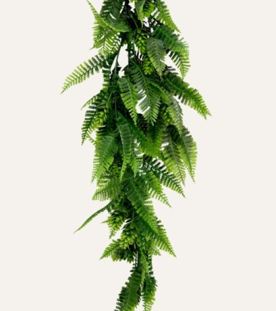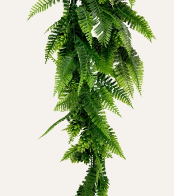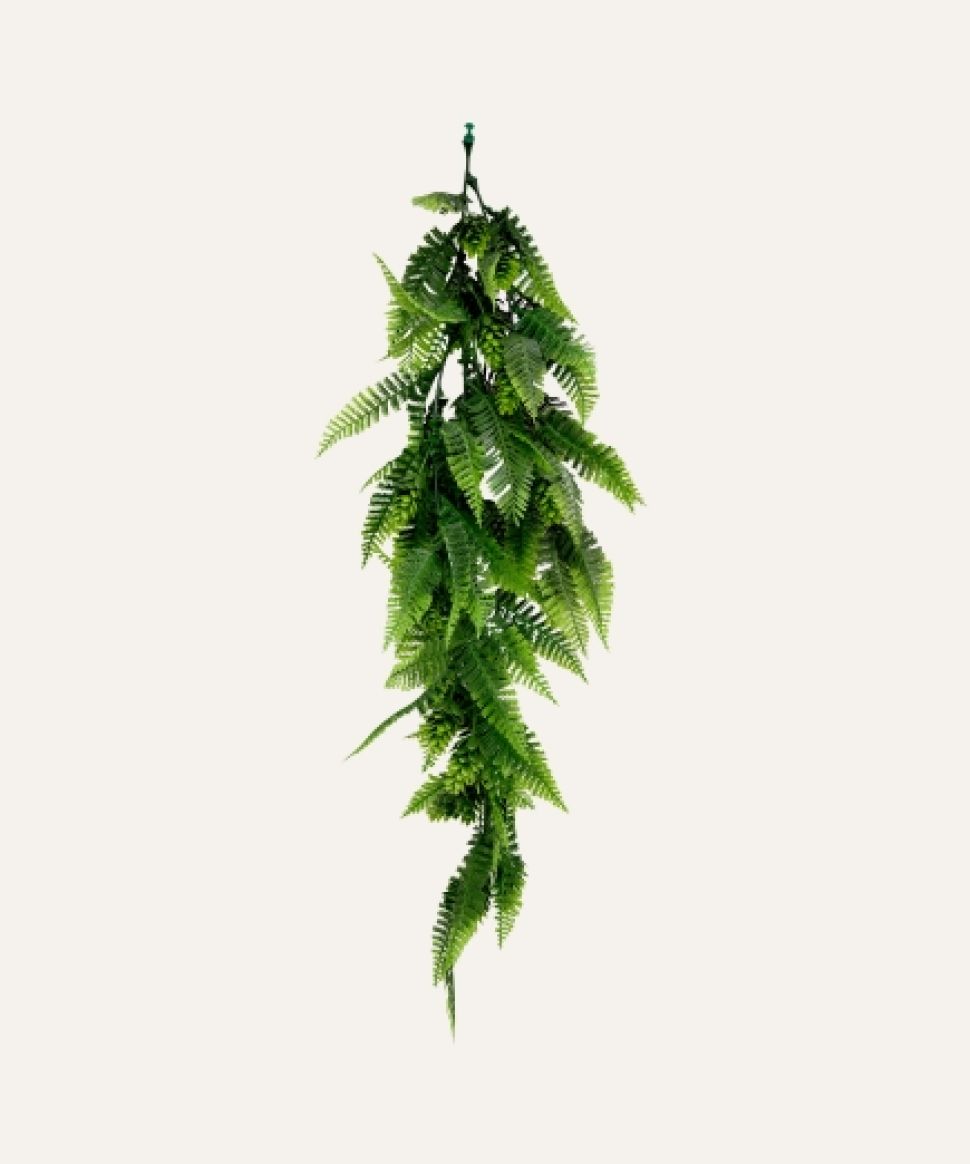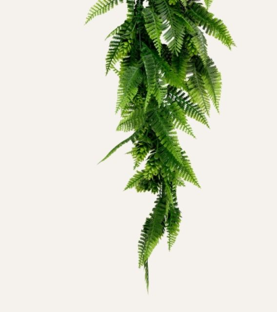 Su estructura flexible y resistente permite una caída uniforme y estable, adaptándose a múltiples aplicaciones tanto en interiores como en exteriores protegidos, como techos, estanterías, paredes o zonas de paso. Libre de mantenimiento, el helecho mixto colgante artificial ofrece una alternativa duradera y estética para hoteles, oficinas, comercios y proyectos contract que buscan vegetación decorativa de alta calidad sin los cuidados asociados a plantas naturales.