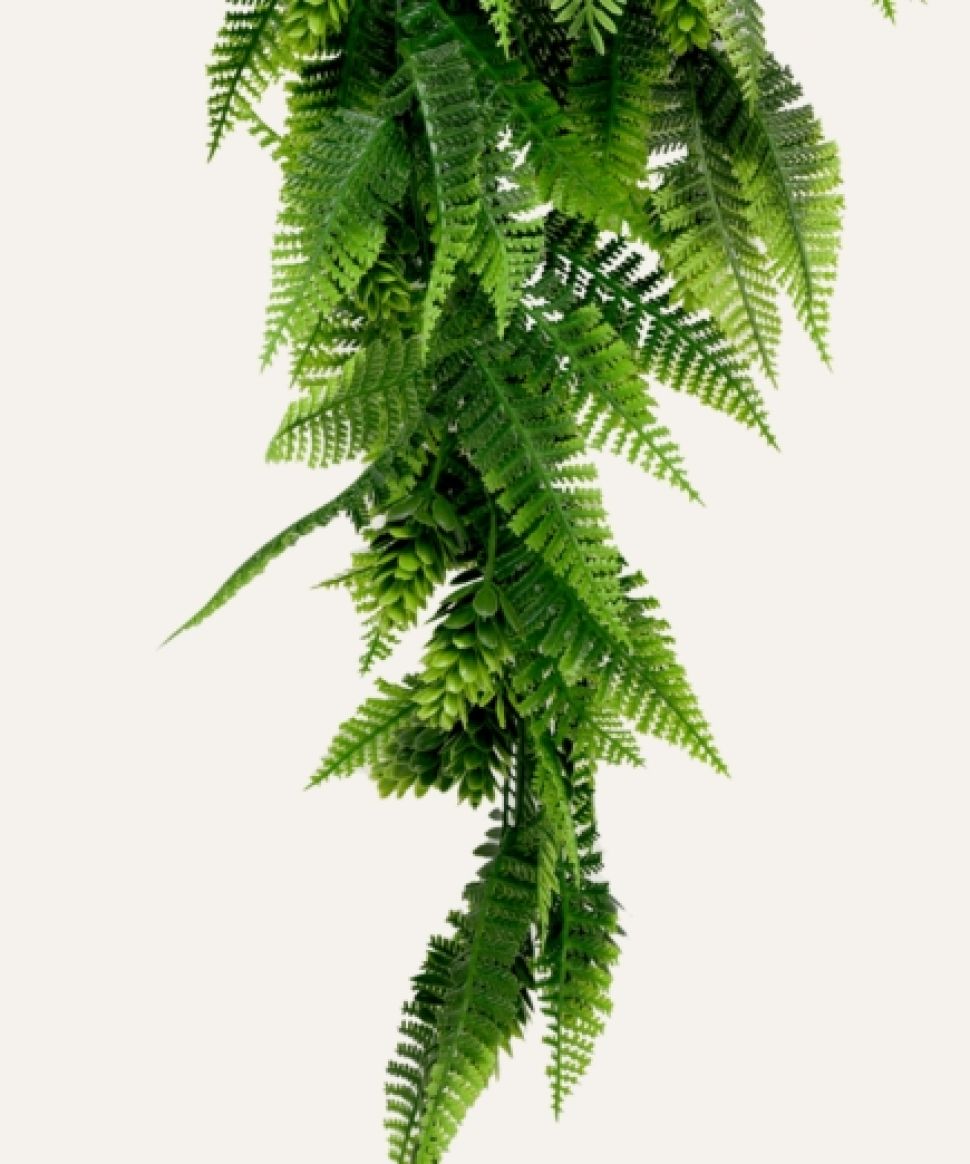 Helecho mixto colgante artificial, realista y resistente, ideal para decoración profesional en interiores y exteriores protegidos.