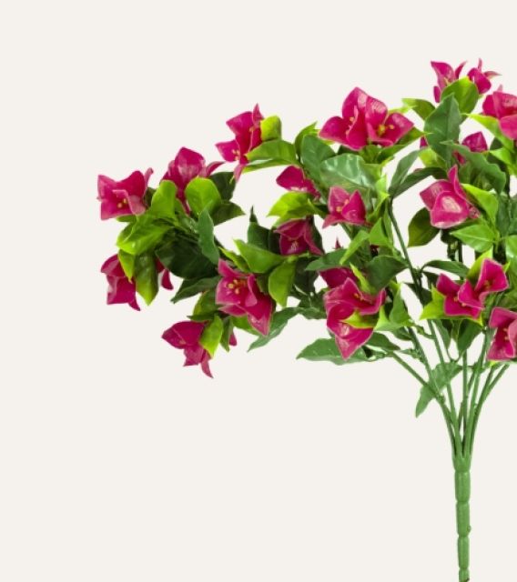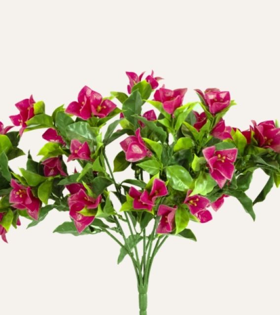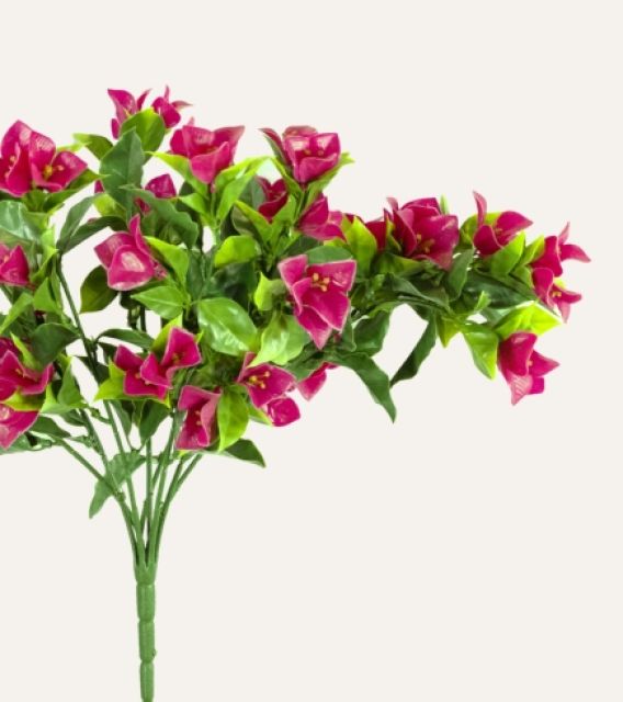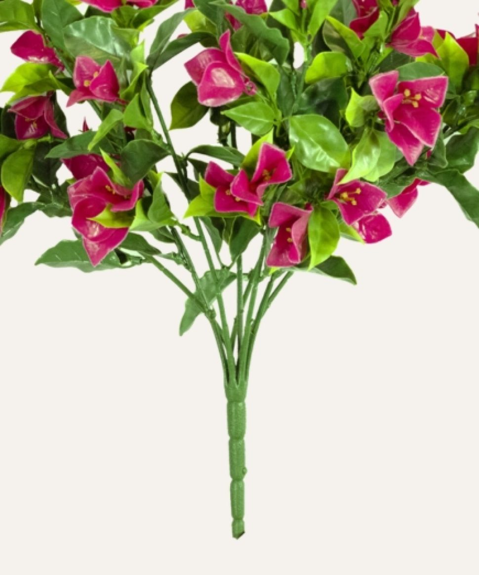El jazmín flor fucsia artificial es un elemento decorativo de gran impacto visual, diseñado para aportar color, frescura y un carácter floral distintivo a espacios profesionales. Su follaje verde combinado con flores fucsia de acabado realista crea una composición vibrante y elegante, ideal para dar personalidad a interiores y exteriores protegidos.