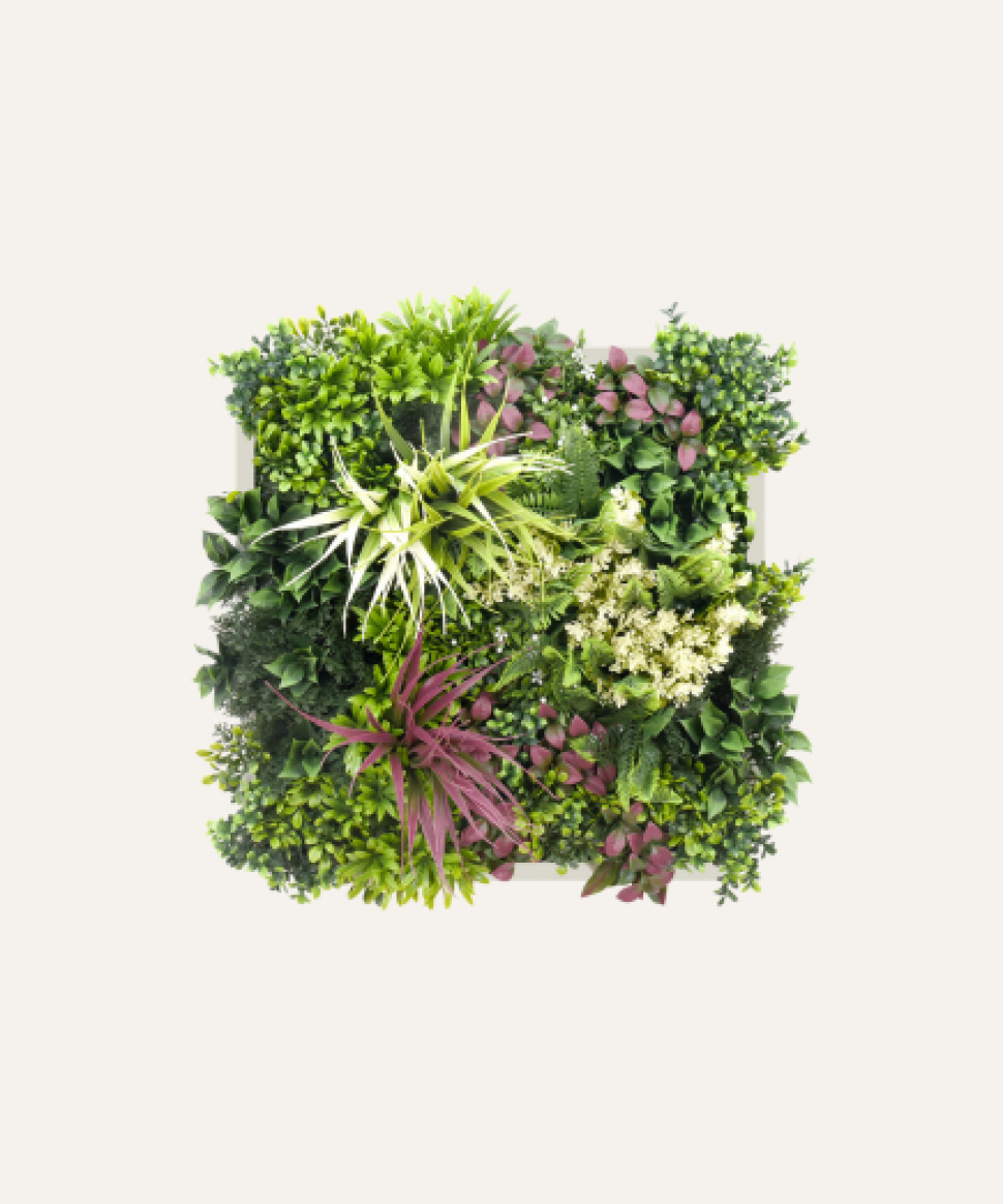 El cuadro vegetal artificial Reina de 50×50 cm combina una selección equilibrada de follajes premium en un formato compacto, ideal para aportar un toque natural y profesional a oficinas, recepciones y espacios comerciales. Su diseño versátil ofrece una estética cuidada y contemporánea sin requerir mantenimiento, optimizando recursos y reforzando la imagen corporativa con una solución decorativa duradera y eficiente.
