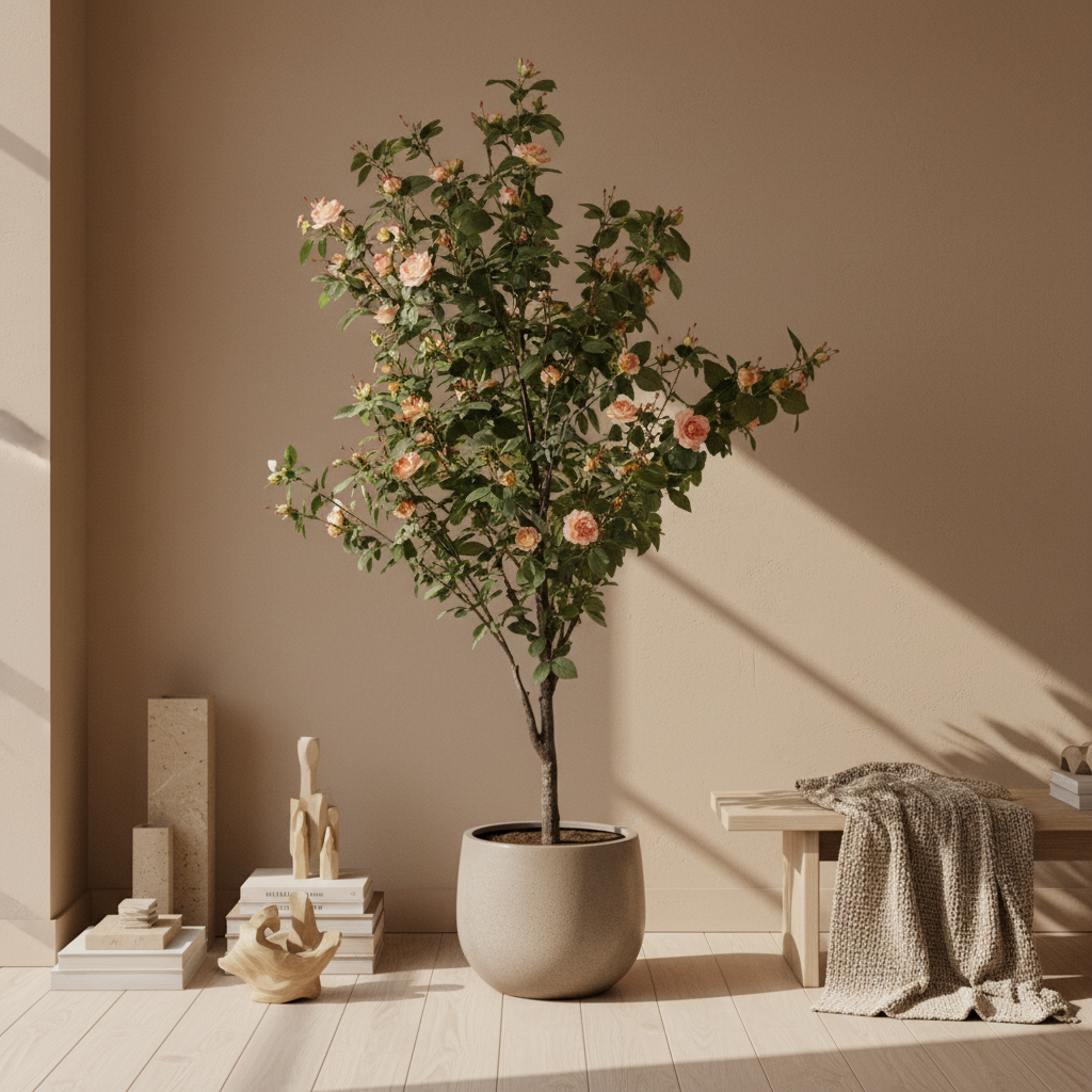 El Rosal rosa artificial de 160 cm, diseñado para uso exclusivo en interiores, combina un follaje detallado con flores de aspecto natural que aportan color y elegancia a cualquier espacio profesional. Su construcción resistente y libre de mantenimiento lo convierte en una solución decorativa ideal para hoteles, oficinas, comercios y proyectos contract que buscan integrar vegetación estética, duradera y uniforme sin generar costes adicionales de cuidado.
