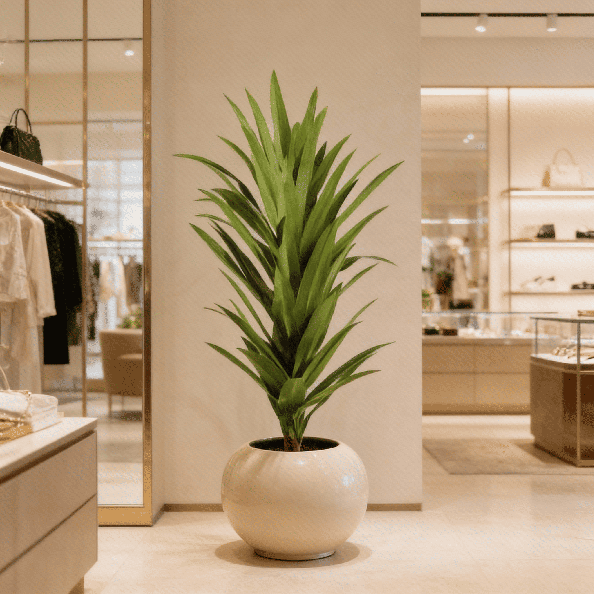 Su estructura resistente garantiza estabilidad y durabilidad, permitiendo su uso tanto en interiores como en exteriores. Libre de mantenimiento, la yuca artificial es una solución estética y práctica para oficinas, hoteles, comercios y proyectos contract que buscan vegetación decorativa de alta calidad sin los cuidados asociados a plantas naturales.